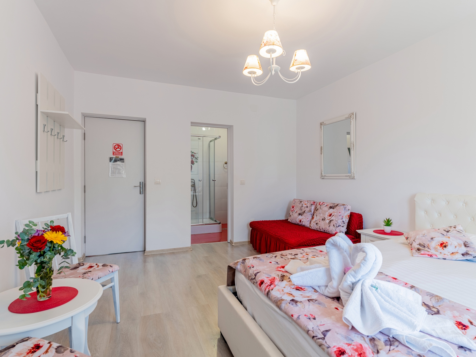 Una dintre camerele duble, cu posibilitate de transformare în cameră tripla/cvadruplă (pat dublu de 160/200 – king size –  și o canapea extinsibilă de 140/200), este situata la parter și este o cameră elegantă cu accente de roz și roșu. Baia decorata cu rosu are cada cu dus si uscator de par.